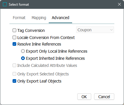 If unchecked, inline references will be exported with the inline reference tagging instead of the actual content pulled in by the inline reference. For example, if an attribute called 'Product Number' has an inline reference to pull in the STEP ID of the object (e.g., 12345), the attribute value will not contain 12345. Instead, it will contain tagging like the following:
