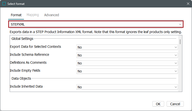 Note: The Mapping tab is enabled when the format selected requires mapping. Selected formats, including STEPXML and Advanced STEPXML, are automatically mapped so the Mapping tab is disabled.