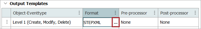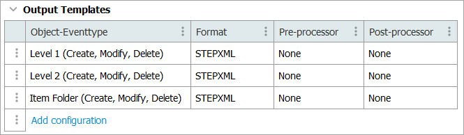 An output template defines the data to be exported and connects it to the desired format. This enables you to use one output format for a specific object type, combined with a specific event type, and another output format for a different object type, combined with a different specific event type. Without an output template, even if events are triggered (based on the Event Triggering Definitions parameters), nothing is exported.