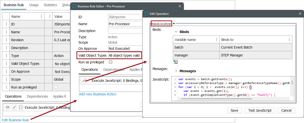 In this example, the target products that are referenced via the Accessory Reference type are included as part of this event. The Execute JavaScript business action is used in conjunction with the Current Event Batch and STEP Manager binds so that any additions, removals, or modifications to the target products are published as part of the source product event. For information, refer to the Business Action: Execute JavaScript topic in the Business Rules documentation, the Event Handling Binds topic, or the STEP Manager Bind topic of the Resource Materials online help documentation.
