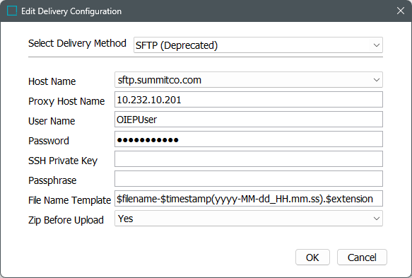 The SFTP (Deprecated) delivery method allows only RSA encryption and there is no timeout, and parameters require that text be manually entered.