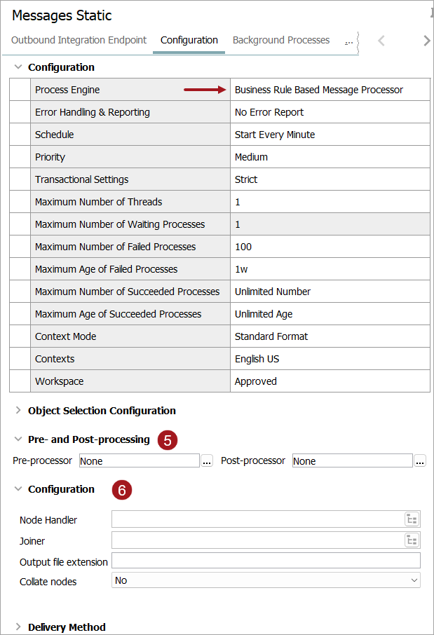 - In the OIEP editor, when using the Business Rule Based Message Processor process engine, specify the pre- or post-processors (if any) as described in OIEP - Event-Based - Pre- and Post-processing Section.