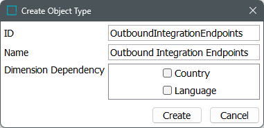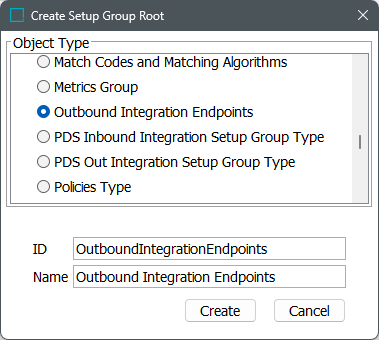 1. In the Create Setup Group Root dialog, select the outbound integration endpoints object type, enter an ID and a Name, and click Create.