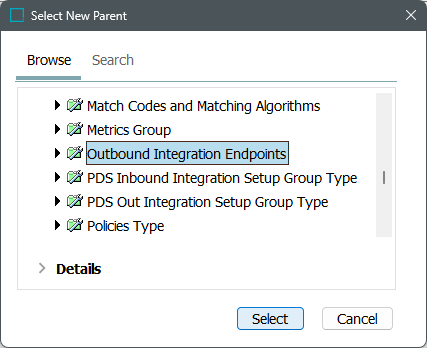 1. In the Select New Parent dialog, select the setup group you created, and click Select to make it a valid parent.