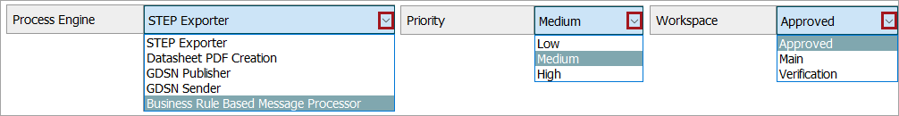 - Click the Process Engine, Priority, or Workspace parameter to display a dropdown button. Selections displayed depend on your system setup.