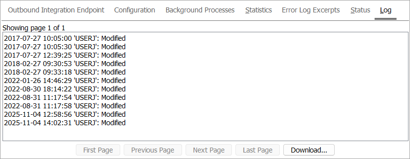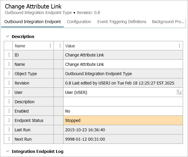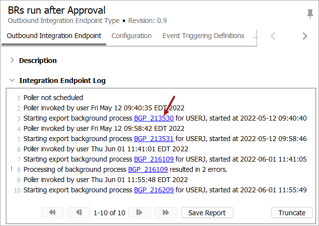 The Integration Endpoint Log section contains information about the endpoint background process. An entry is generated each time the endpoint is invoked, when background processes generated by the endpoint are started, and when processing errors occur.