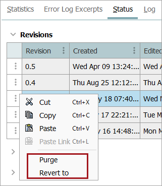 )to the left of a revision row to display a menu that allows you to revert to the changes for the selected revision or delete (purge) the selected revision.