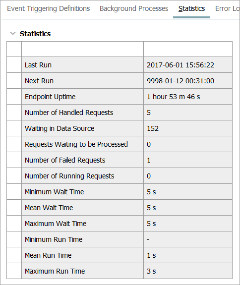 This tab provides statistics about the number of requests handled, run times, and wait times. The information cannot be edited nor exported.