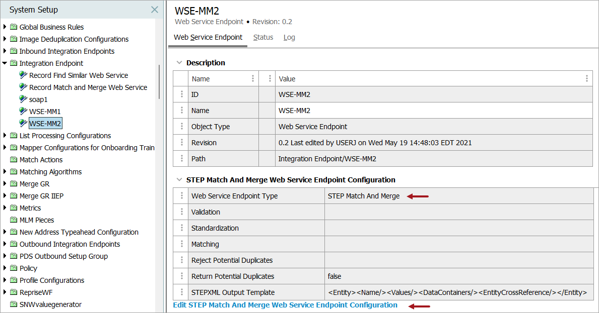 Click the 'Edit STEP Match and Merge Web Service Endpoint Configuration' link to configure as follows.
