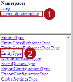 At the top, under the Namespaces heading, click the /step/outputtemplate link and scroll down to select the EntityType link from the complexTypes list.