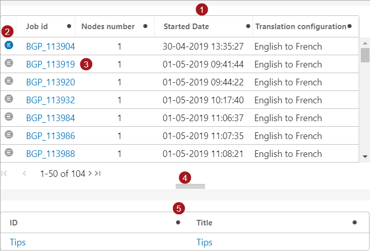 5. Job Node List Screen: Details information regarding selected translation. Header columns 'ID' and 'Title' are set by default, but can be modified during screen configuration.
