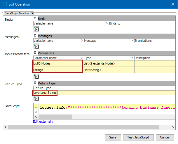 As shown in the following image, to use the Business Function feature for asynchronous translations, two input parameter types are required: List<? extends Node> and List<String>. The Return Type java.lang.String must also be used. The returned value will contain the STEP URL(s) of the node(s) that will be included in the translation. If multiple nodes require translation, the URLs must be separated by a pipe '|'.