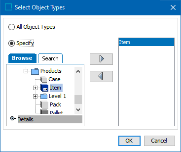 In the dialog, click the Specify radio button to enable the Browse and Search tabs for the Tree window. Select the relevant object type(s), then click the right-facing arrow () to add the object type(s) to the filter. To remove an object type from the filter, select it and click the left-facing arrow ().
