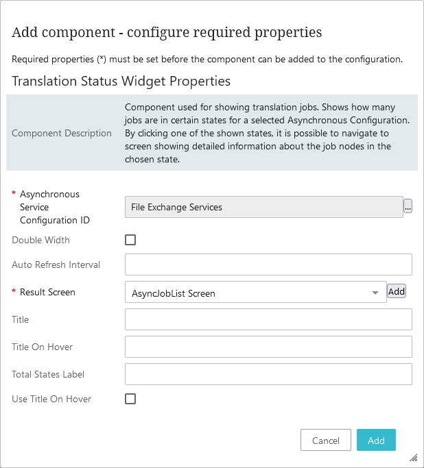- In the Add Component dialog, select 'Translation Status Widget' and click 'Add.'