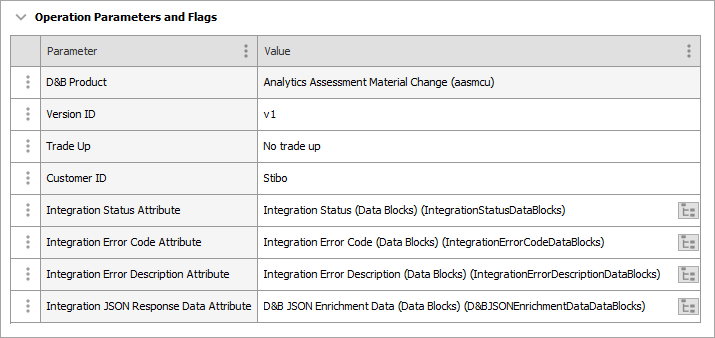 Create a new Operation Configuration and select the D&B data blocks product (if not available, any product can be selected and the request query parameters will define what data and levels to return). Populate the additional parameters with new attributes to hold the specific integration info and JSON response for the Data Blocks request.