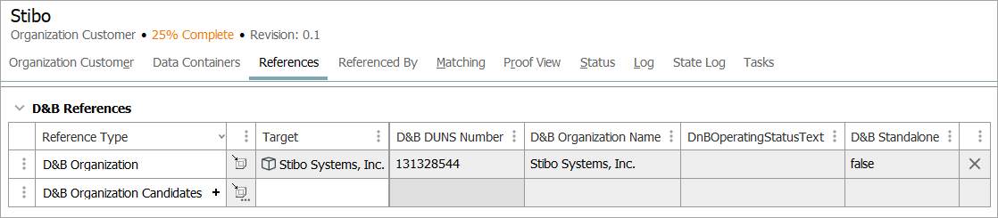 For organization entities that have multiple match candidates, a single candidate must be manually selected. The Web UI is recommended for this process. Detailed information for configuring and using the Web UI for D&B can be found in the D&B in Web UI topic.