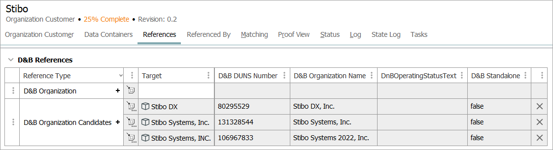 When multiple match candidates are found, a D&B reference is made from the customer record (organization entity) to each candidate record (D&B record / D&B organization entity) based on the D&B Match Candidate Reference Type in the component model.