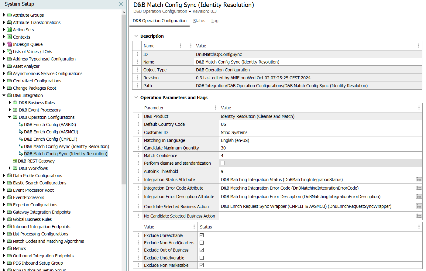 For synchronous matching, the recommendation is to use the Web UI. The configuration is 'D&B Match Config Sync (Identity Resolution)' (ID: DnBMatchOpConfigSync).