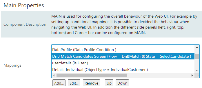 Map a Workflow Condition in the Main Properties to configure access to the D&B Match Candidates Screen. Create a Workflow Condition for each state of the D&B workflow and select the screen you just created for the Screen Mapping Properties. Setup details are included in the Mapping Workflow States in Web UI topic.
