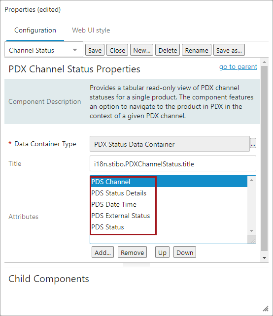 Note: Although the attribute 'Product Channel URL' can be added to the component, it is not necessary as the link for the URL is already included in the 'PDX Channel' column. It is recommended that the pre-configured attributes are left as-is for optimal performance.