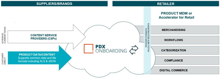 The PDX Onboarding solution connects with the STEP product MDM solution to enable manufacturers, suppliers, and brands to receive requirements from the retailer, such as new SKUs, new logistics requirements, and updates to regulatory data.