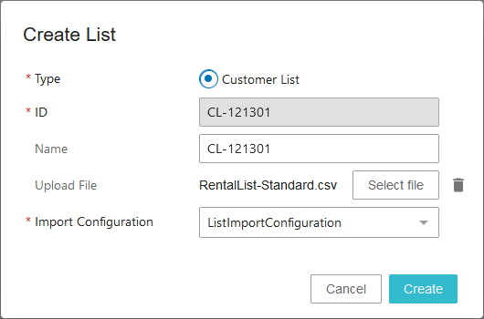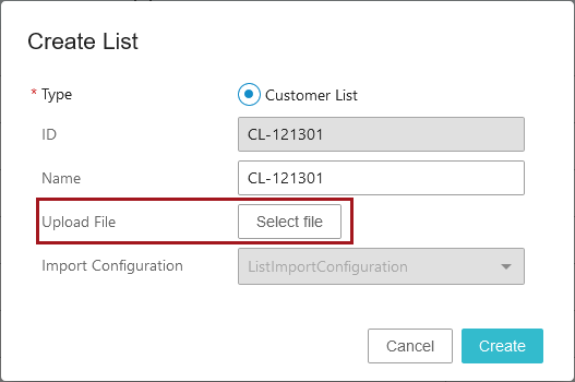 - Click the Create button to show the 'Upload' dialog for the duration of the list upload process.