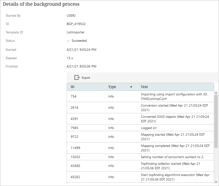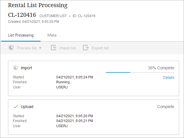 - If a file was uploaded, two process cards are displayed: one for the completed upload process and one for the ongoing import process. Both include start and stop timestamps and the user ID.