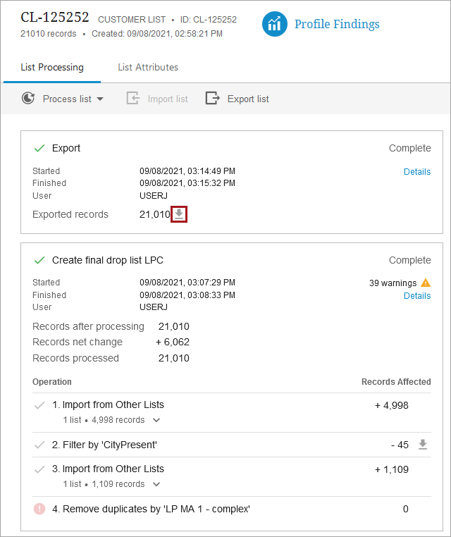 ) to download a copy of the processed records list. Exporting list is handled by a BGP and process details can be found in the BGP log including any errors and warnings that occurred.