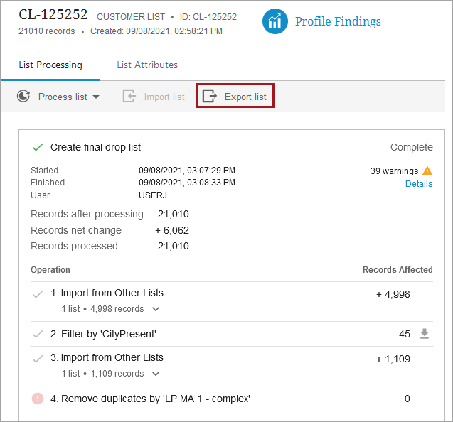 Once the desired processing is performed on the imported list, users can export the list to share the modified list with downstream teams or applications.