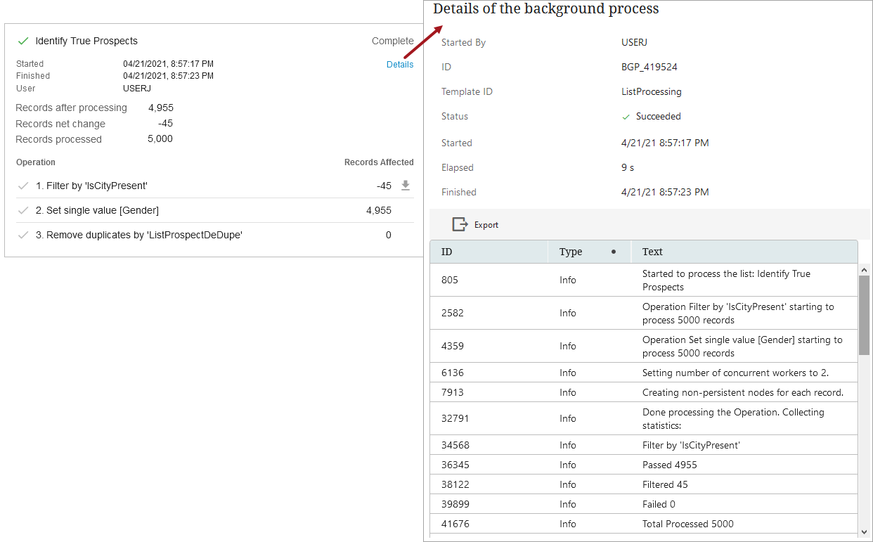 When a list process operation fails or completes with errors, review the BGP logs by clicking the Details link on the process. Users with a successful list process may also view useful information in the logs. For more information, refer to the Background Process Node Details Screen topic in Web User Interfaces documentation.
