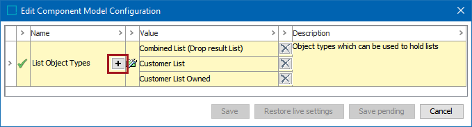 1. On the 'Edit Component Model Configuration' dialog, click the plus button () to choose the object type(s) that can hold a list. In this example, the list object types are shown in the 'Value' column since they are valid list processing object types.