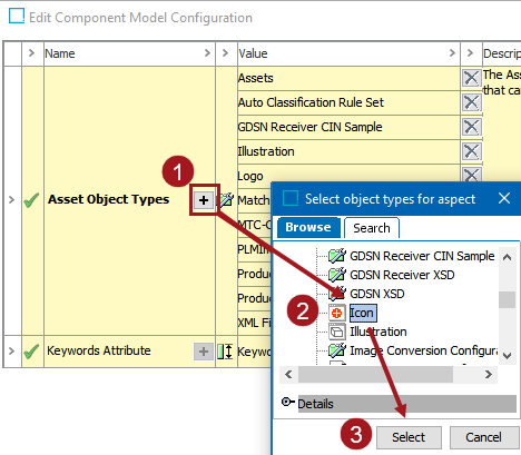 - Select the asset object type(s) that you want to add to the component model, then click Select.