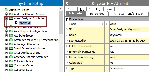 - The attribute used to store keywords, which is, by default, Keywords (AssetAnalyzer.Keywords)