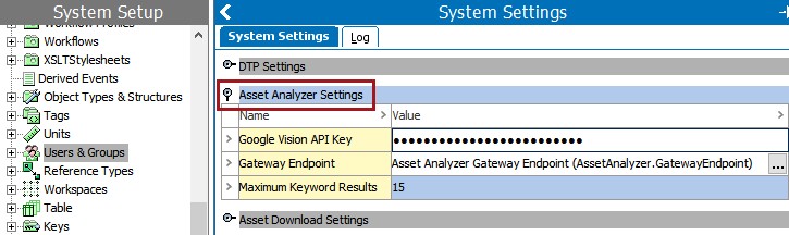 - Google Vision API Key: This field is used to authenticate requests to the Google Cloud Vision API. To use the Set Asset Keywords functionality in the Asset Analyzer component, you must have a valid Google Vision API Key, which is obtained from Google.