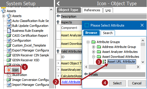 - Locate the asset object type that you want to add to the component model under System Setup > Object Types & Structures > Assets. In the following example, the Icon object type is used.