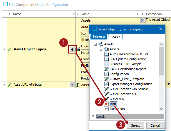 - Select the asset object type(s) that you want to add to the component model, then click Select.