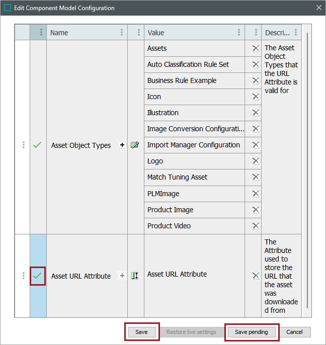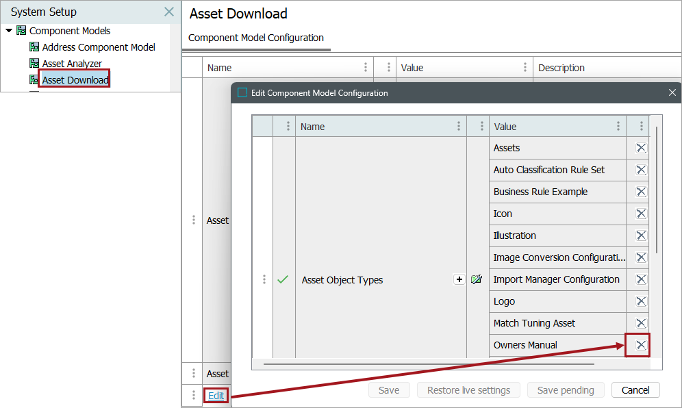 - The Save and Save pending buttons are activated. Click Save to remove the asset object type and close the 'Edit Component Model Configuration' dialog. Click Save pending to keep the live configuration as-is and make additional changes later.
