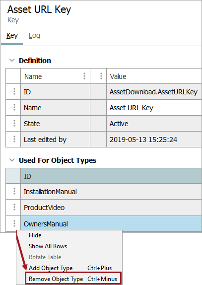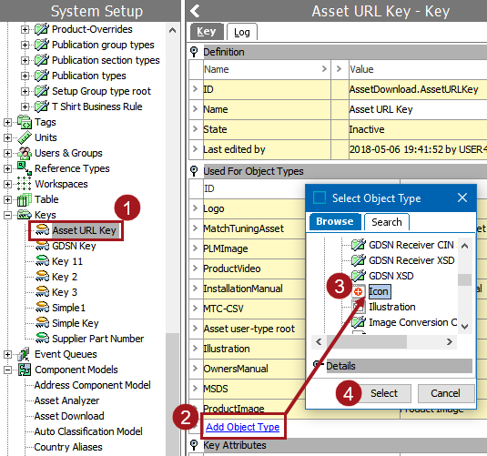- Return to the Asset URL Key and click the 'Add Object Type' hyperlink under the 'Used for Object Types' flipper on the Key tab.