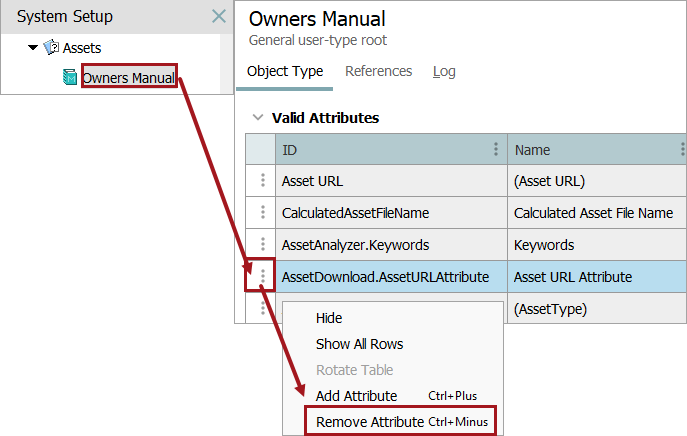 - Under the Valid Attributes flipper, right-click on the ellipsis button in the row containing the AssetDownload.AssetURLAttribute attribute, then click Remove Attribute.
