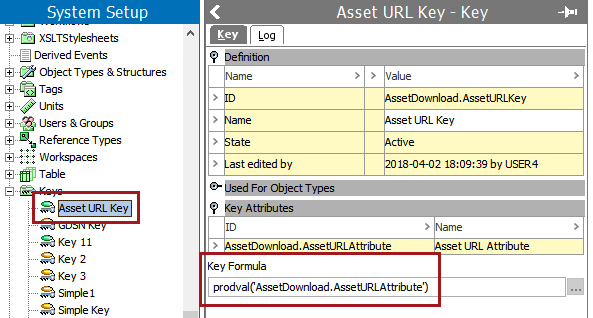 When Asset Download is installed, a unique key named Asset URL Key (AssetDownload.AssetURLKey) is created upon installation that is used to return the value of the Asset URL Attribute when identifying whether an asset has already been downloaded. By default, all asset types in the system are valid for the key. The Key Attribute is Asset URL Attribute and the Key Formula is based on the value of this attribute. The formula is: