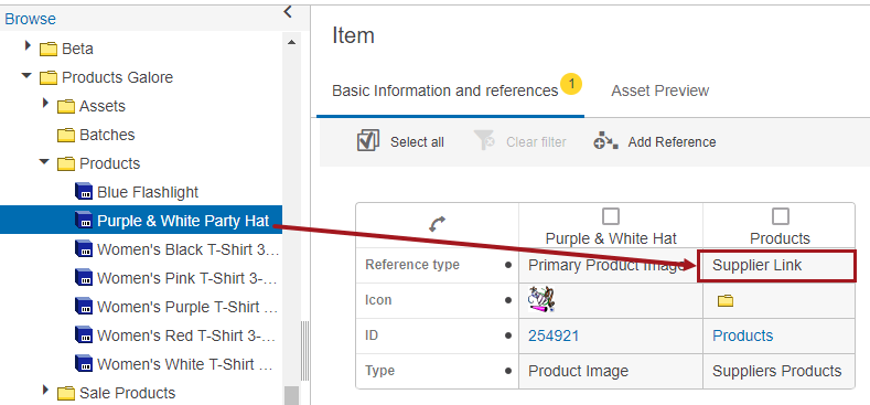 The below screenshot shows the same 'Products Galore' classification structure, this time with a product object selected. The product's references are shown in the Multi Edit Display Mode component. The link to the parent Products folder is of the type Supplier Link (SupplierLink). So, for this example, this will be a valid link type to connect product objects to the supplier product folders used for Asset Download.