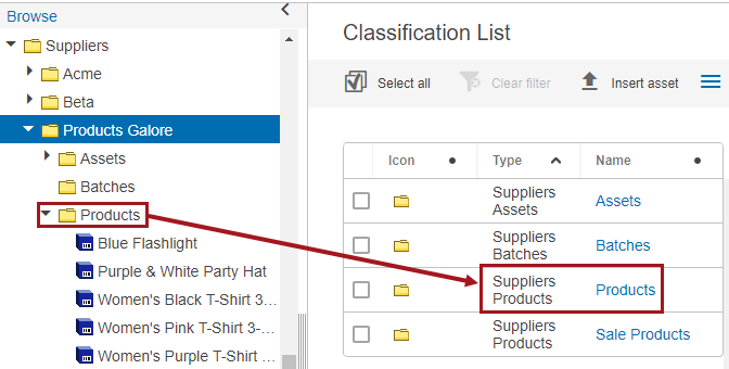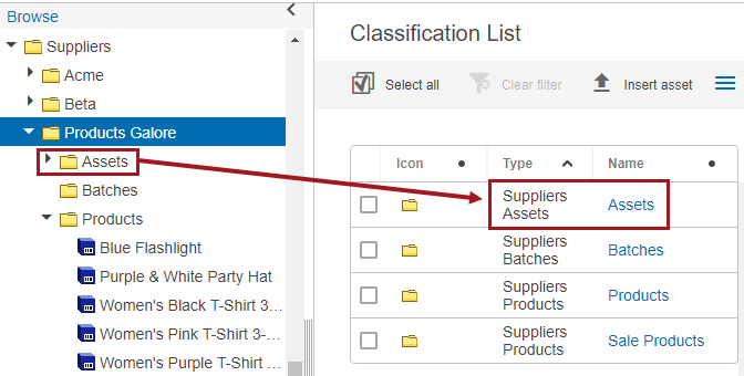 The below screenshot shows the same 'Products Galore' classification structure. The folder named 'Assets ' is of the object type Suppliers Assets (SuppliersAssets). So, for this example, this will be a valid folder in which to store assets that will be used for Asset Download.