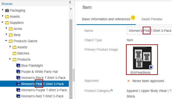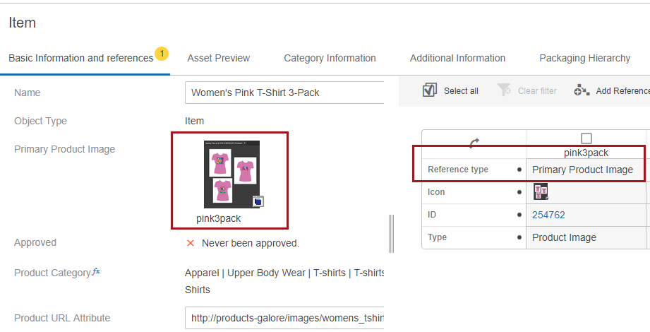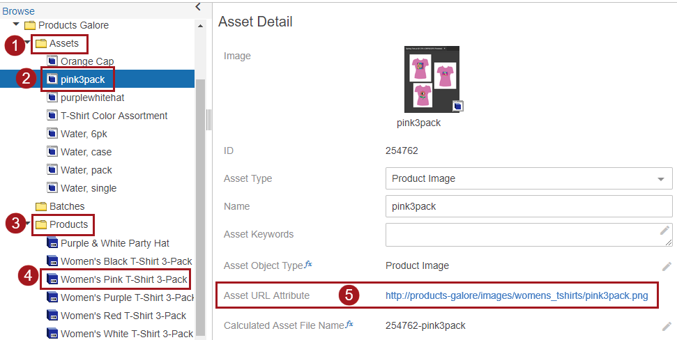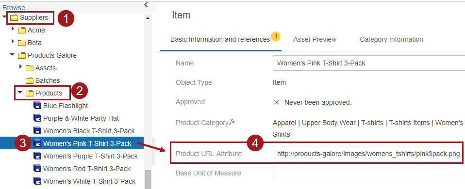 1. In the Web UI, for our example, there are multiple products stored in a Suppliers classification structure (1, below) within a Products folder (2). The product named 'Women's Pink T-Shirt 3-Pack' (3) is selected, and contains a URL to an asset in the 'Product URL Attribute' field (4).