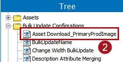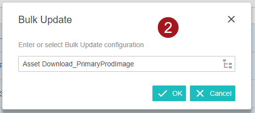 1. To perform the bulk update, click the Bulk update action button, then choose the 'Asset Download_Primary ProdImage' bulk update configuration. For information on how to add an action button to a Node List Properties screen, refer to the Action Button Configuration on a Node List topic in the Web User Interfaces documentation.