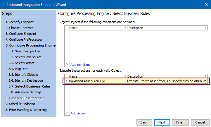 Another example of where a Create Assets from URL business action can be executed is when products are imported into STEP. The below screenshot shows a sample screen from the Inbound Integration Endpoint Wizard, where a business rule named 'Download Asset From URL' has been specified to execute for each valid object on import.