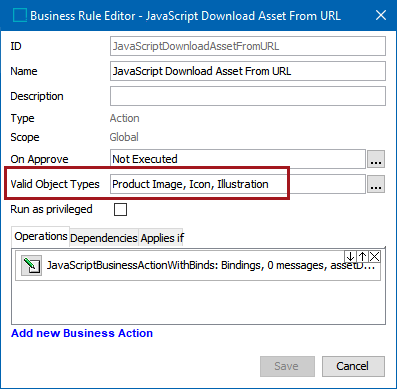 1. In this example, the business rule is named 'JavaScript Download Asset From URL' and the valid object types are image assets—Product Image, Icon, and Illustration.