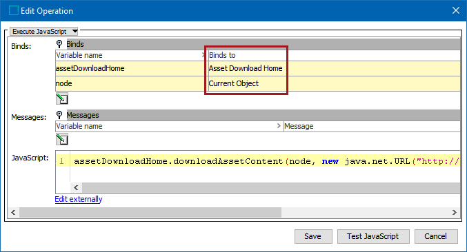 1. Two binds are used: Asset Download Home and Current Object. The sample JavaScript (not fully pictured in the screenshot below) contains the asset URL within the script: