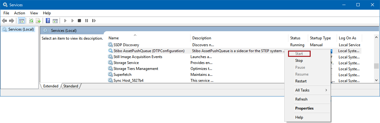 To start the Asset Push Sidecar, go to the Windows Services component. In the Services window, locate the Stibo AssetPushQueue (assetpushqueue-DTPConfiguration). On the entry, right-click and select 'Start.'