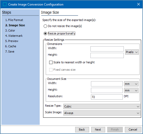 If changes are necessary, select Resize proportionally, then specify the dimensions, document size, resize type, and scale image settings. For details about the image size options, refer to the Image Size topic.