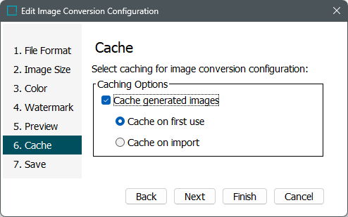 - Cache on first use - the converted image is not cached until the first time it is accessed for viewing, exporting, or in an image preview.